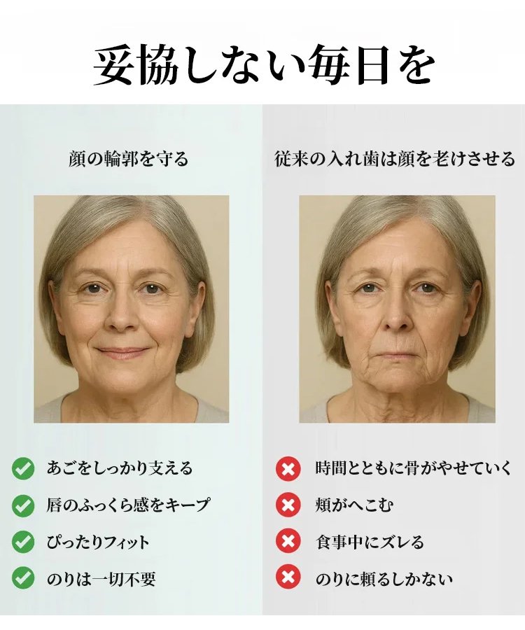 吸着式入れ歯は接着剤不要で、一日中快適かつ安定した装着感を提供します。インプラントよりはるかに低価格で、インプラント級の安定感を。